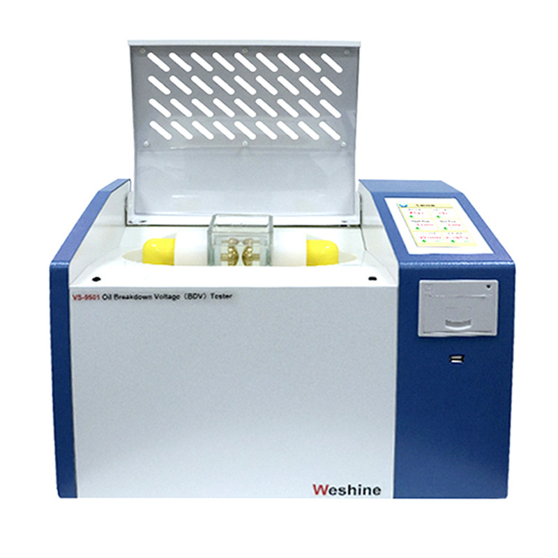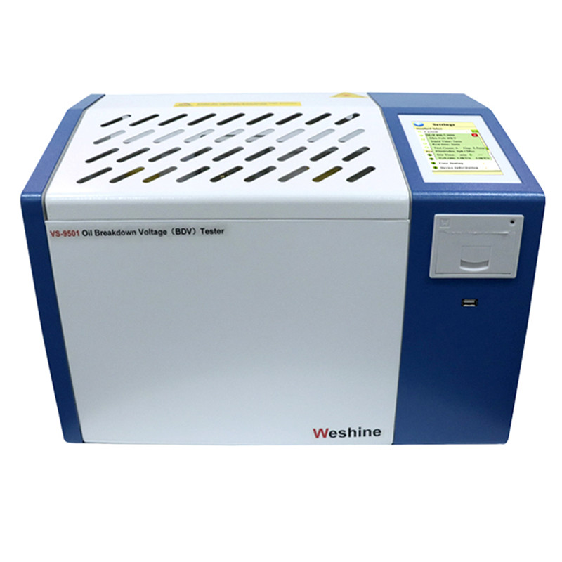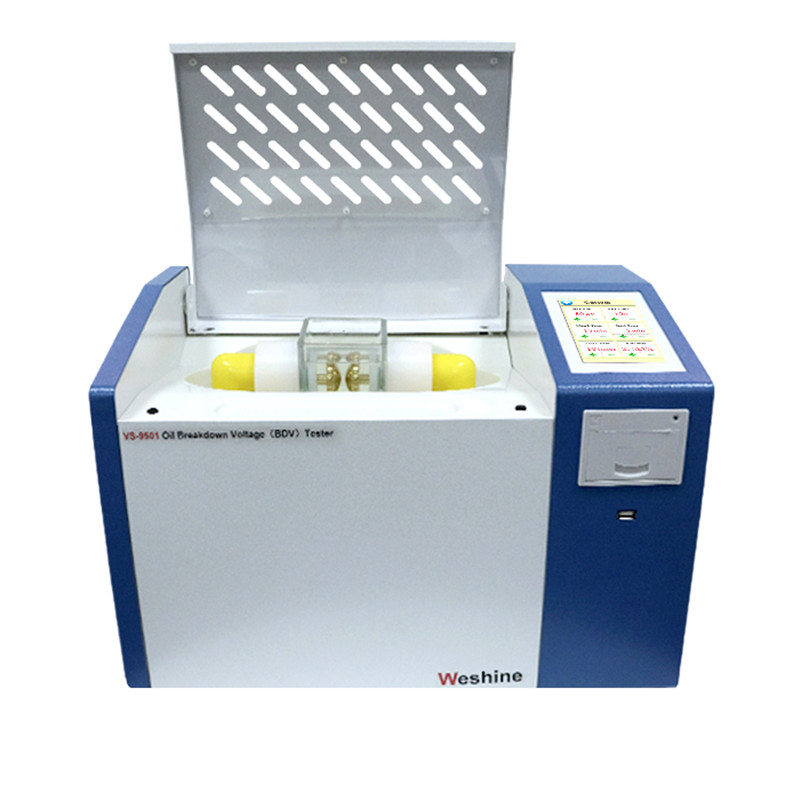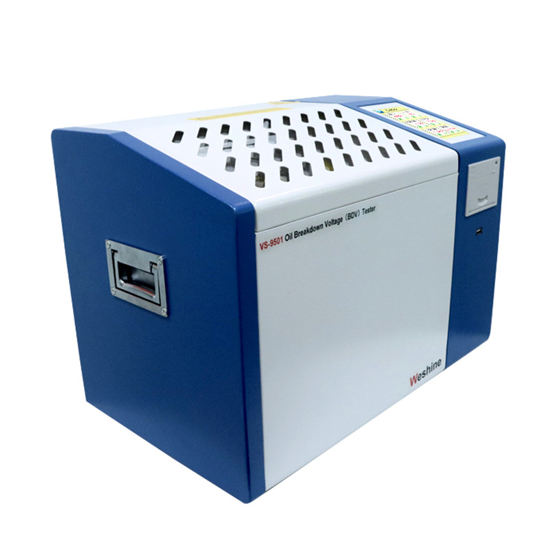 Inimbento ni Weshine ang serye ng VS-9501 ay isang ganap na awtomatikong transformer oil BDV test kit na idinisenyo gamit ang mga advanced na teknolohiya para sukatin ang 11 kV Transformer Oil BDV Value, na may mabilis na kakayahang sensing na sukatin ang tumpak na breakdown voltage. Sumusunod ang serye sa mga pambansa at internasyonal na pamantayan para sa mga pagkakasunud-sunod ng pagsubok at mayroon ding user friendly na customized na mga pagkakasunud-sunod ng pagsubok. Ang serye ay may malaking color touch screen na display para sa madaling operasyon. Ito ay binibigyan ng panloob na memorya upang mag-imbak ng hanggang 100 mga pagsubok at isang inbuilt na thermal printer para sa on-site na pag-print ng ulat. Para sa kaligtasan, ang aming serye ng transformer oil testing machine ay may tampok na open ground detection upang maiwasan ang pinsala. Ang molded oil test vessel ay angkop para subukan ang mga mineral, ester at synthetic na langis at may kasamang adjustable electrode gap setting para magsagawa ng mga pagsubok ayon sa mga pamantayan.